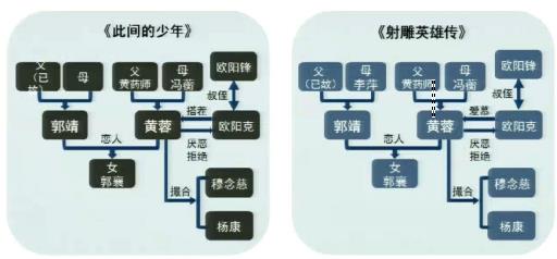 比如郭靖和黄蓉是恋人关系,两人从身世到出场再到相识相知相恋的过程都能从《此间》中看到《射雕英雄传》的影子。