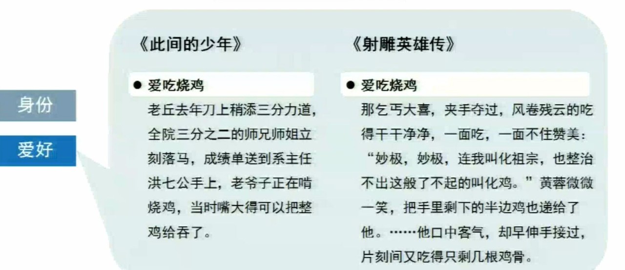 就比如说黄蓉吧,美丽、聪明只是抽象层面的相似,在表达上却有所不同,《此间》中的聪明是会在图书馆换到双人座,和郭靖坐在一起,但在《射雕英雄传》中的聪明是学了黄药师的“鬼心眼”。