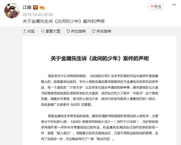 可这书都已经出版16年了,怎么金庸这会才想起来维权?原来是江南把《此间》影视剧版权卖给了华策影视,华策出于谨慎考虑,曾去向金庸确认是否有授权。