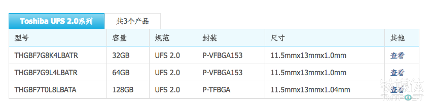 华为使用的东芝 UFS 2.0及UFS2.1产品型号 来源:东芝官网