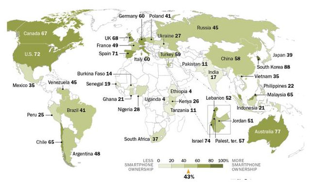 在智能手机普及率较高的发达国家中,美国普及率为72%,加拿大普及率为67%,英国普及率为68%,德国普及率为60%,意大利普及率为60%。澳大利亚普及率为77%。