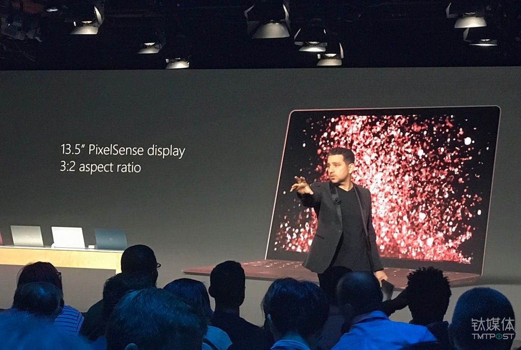 Surface Laptop笔记本采用了全世界最薄的LCD显示屏,重2.76磅,厚14.5mm,可单手打开,其拥有13.5英寸Pixel Sense屏幕,340万像素,屏幕周边无橡胶,这些参数配置逼近苹果的MacBook。