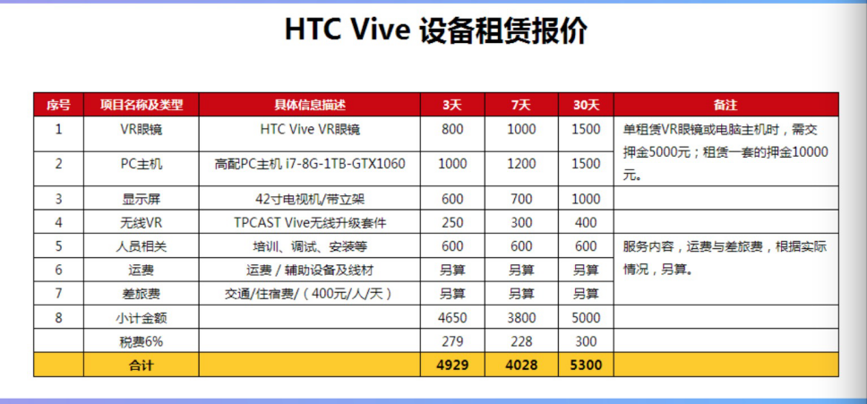 不过,从表单中可以看到,除了不菲的租赁费用,押金也是一个不低的门槛。如果只租赁VR眼镜或电脑主机,要交纳5000元押金;如果租赁一套设备,要交纳10000元押金。毕竟,电子设备存在不小心损坏的情况。从押金和租金价格的形式,可以看出HTC完全不是针对个人消费级市场推出这种服务。那么,商业应用场景中,也只有企业在偶尔使用尤其是活动中会有这种租赁的需求了。