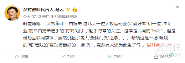 关于最近饱受热议的“格斗与太极拳”事件,马云今早在微博上发表文章,针对近日的事件也发表了自己的观点。