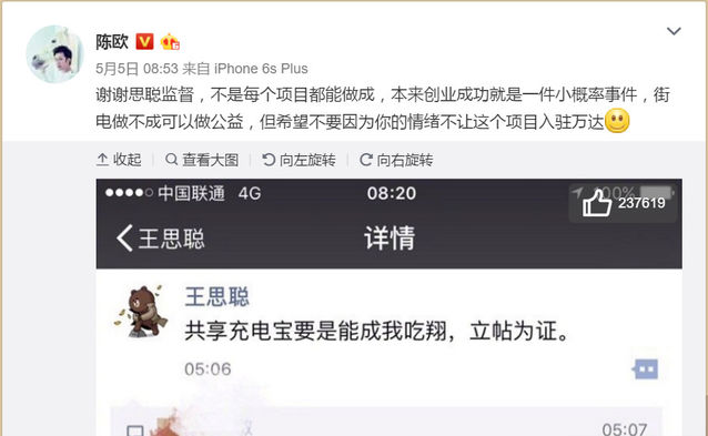 面对王思聪的唱衰,陈欧在微博中回应说:“谢谢思聪监督,不是每个项目都能做成,本来创业成功就是一件小概率事件,街电做不成可以做公益,但希望不要因为你的情绪不让这个项目入驻万达。”