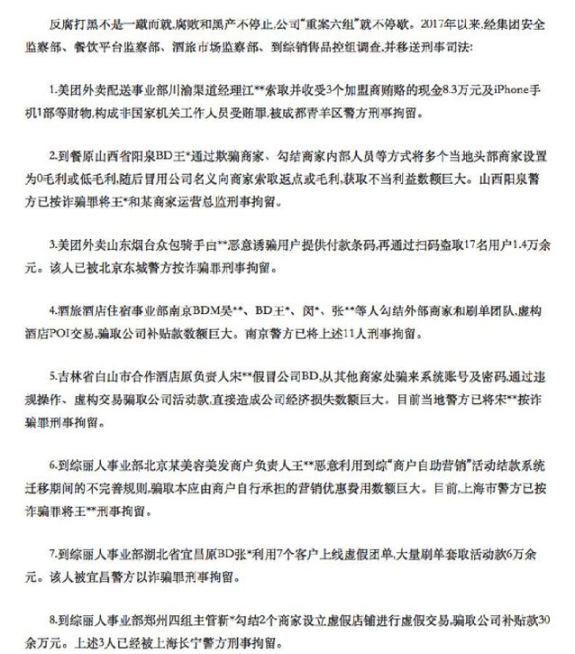 日前,美团点评通过内部邮件实名公布了10起反腐败打黑产刑事案件。