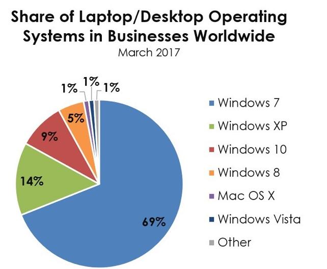 另据StatCounter今年3月份最新统计数据表明,Windows 7仍然是全球市占率第一的Windows桌面操作系统。具体来说,Windows 7今年3月份市占率为47.03%,继续维持第一,Windows 10月度市占率达到34.28%,增速有所放缓。而具体到重要的商用市场,据Spiceworks统计数据显示,截至目前,Windows 7在商业领域占比69%,而Windows XP则是14%,Windows 10仅为9%, 2001年推出的Windows XP在商业市场上的用户比Windows 10更多,尽管它自2014年4月8日起不再接收微软更新和安全补丁。