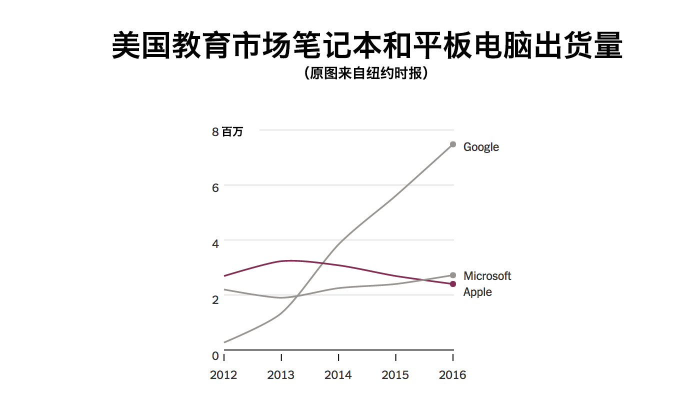 从营收看,据市场研究机构IDC的数据,美国学校、学院以及大学2016年在移动和桌面计算机上的支出为73.5亿美元,而苹果设备只占到28亿美元,较2015年的32亿美元出现下滑,占比为38%;Windows设备销售额在2016年占到25亿美元,较2015年的21亿美元出现小幅上升,占比为34%;Chrome设备达到19亿美元,而上年为14亿美元,占比为26%。