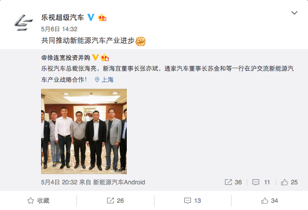微博的内容很简单,只是一则几方公司关于合作的消息,内容为“乐视汽车总裁张海亮,新海宜董事长张亦斌,通家汽车董事长苏金和等一行在沪交流新能源汽车产业战略合作”。