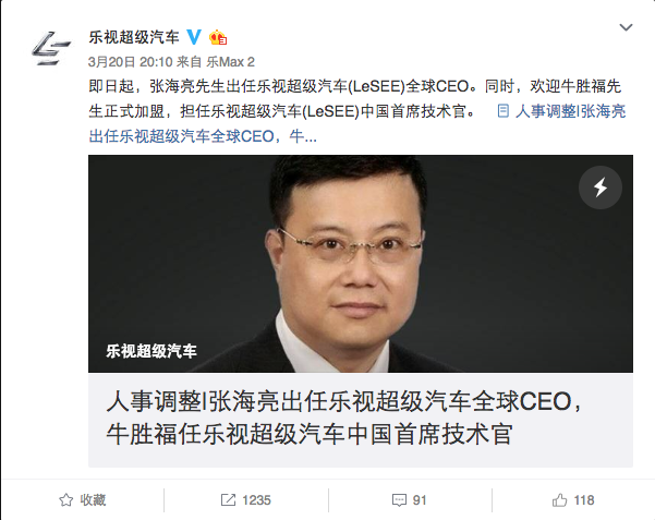钛媒体快讯|乐视超级汽车官方微博转载了一则关于张海亮的消息,疑似是针对最近流传的“张海亮离职”传言进行否认。