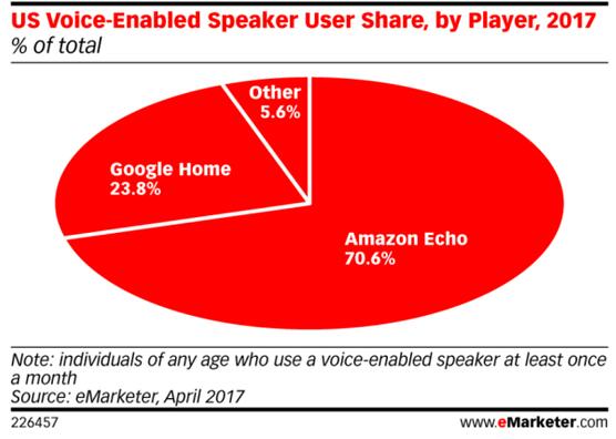 近日,市场咨询公司eMarketer的报告显示,亚马逊在语音控制市场占据统治地位,即亚马逊凭借Echo智能音箱占据美国语音智能音响用户约70.6%的份额,远远领先于谷歌,谷歌只占了23.8%,其它企业合计占有5.6%的市场,这些企业包括联想、LG、哈曼-卡顿、Mattel。
