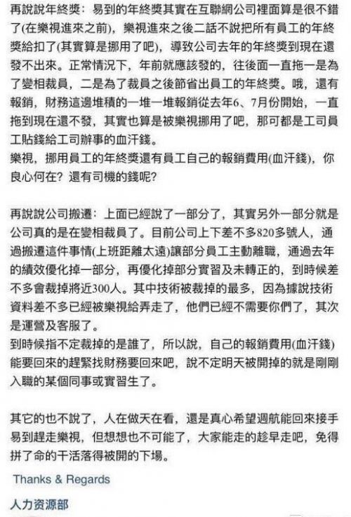邮件还称,目前公司上下差不多820多号人,通过搬迁这件事情(上班距离太远)让部分员工主动离职,通过去年的绩效优化掉一部分,再优化掉部分实习及未转正的,到时候差不多会裁掉将近300人。其中技术被裁掉的最多,因为据说技术资料差不多已经被乐视给弄走了,他们已经不需要你们了,其次是运营及客服了。