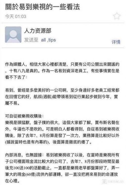 有网友爆料称,易到HR今日凌晨以易到人力资源部的名义群发邮件炮轰乐视,不过该邮件很快被删除。对此,易到方面回应称,今日凌晨有不法分子侵入易到公司邮箱系统,冒用HR邮箱,恶意捏造和散布针对我司谣言。易到方面还表示,不法分子恶意捏造和广泛散布谣言,严重侵犯了公司声誉,涉嫌构成非法侵入计算机信息系统罪、损害商业信誉罪。对此,公司已第一时间向公安机关报案,目前,警方已在调查取证。据悉,该邮件全文均为繁体字。根据邮件中内容称,易到“曾经是一个多么美好的公司”,但自从被乐视收购以来,除了去年7、8月算了发了一次力,业务算是比较好以外,后面算是彻底萎了。