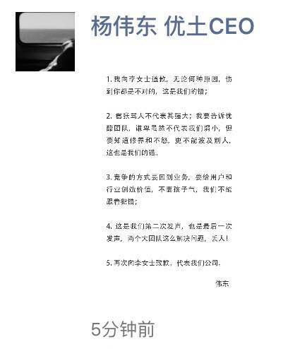 而就在11日晚间11点左右,优酷土豆总裁杨伟东在其个人微博和微信朋友圈对事件再次进行了致歉回应,并表示,“这是我们第二次发声,也是最后一次发声,两个大团队这么解决问题,丢人!”