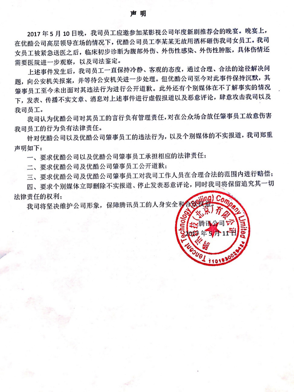 直至今日晚间,腾讯方面发布落款为“腾讯公司”的态度强硬的声明称,因优酷员工无故砸伤腾讯女员工,优酷对员工负有管理责任,对在公众场合放任肇事员工故意伤害腾讯员工的行为负有法律责任,要求优酷公司及优酷公司肇事员工公开道歉并赔偿,同时要求个别媒体删除不实报道,俨然将问题上升之公司层面并扩大化。