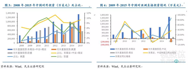 相对而言,中国对美国和欧盟的直接投资则稳中趋缓。2014和2015年三地总投资同比增速分别为12%和37%,主要为中国对东南亚的直接投资分别增长8%和87%(中国对东南亚国家的直接投资占比80%以上)。