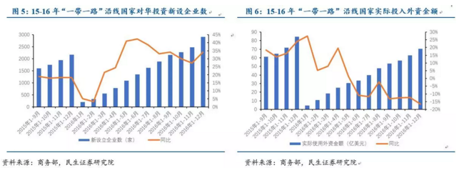 吸引外资方面,2016年1-12月,“一带一路”沿线国家对华投资新设立企业2905家,同比增长34.1%,实际投入外资金额70.6亿美元,同比下降16.5%。2016年以来“一带一路”沿线国家对华投资新设立企业同比大幅上升,实际投入外资金额同比大幅回落,部分原因为高基数,其次为新设企业家数与投资额并不一定成正比。