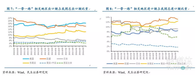 贸易方面,根据商务部公布数据,2016年1-11月,中国与沿线国家贸易额达8489亿美元(出口5234亿美元、进口3255亿美元),占同期我国外贸总额的25.7%。2013年-2016年间,中国对东南亚、中亚和南亚、美国和欧盟进出口占比均有所提升,对南亚和中亚、西亚和北非地区进口额占比有所下降。