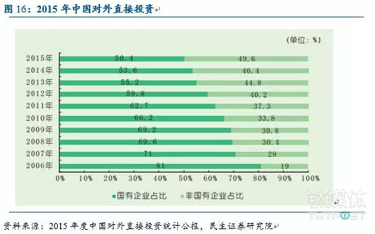2015年中国非金融类对外直接投资存量9382亿美元,国有企业和非国有企业平分秋色,其中国有企业占50.4%,非国有企业占49.6%。而在2006年国有企业占比81%,2006-2015年国有企业占比逐渐降低,非国有企业逐步成为走出去的重要力量。