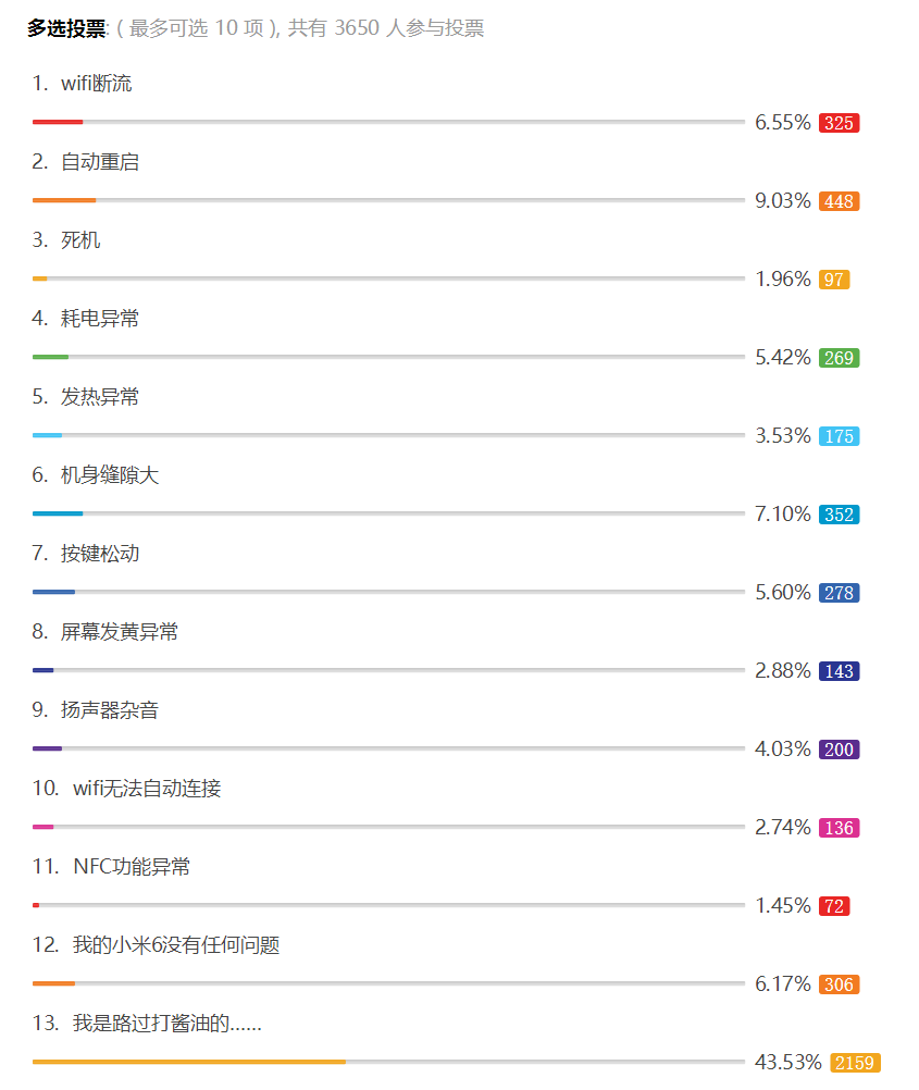 小米值得表扬的地方在于,小米社区中关于小米的负面信息不会被删除,是比较尊重用户的。从小米社区上可以看到小米6的品控情况。有一项关于小米6出现问题的调查,3650人参与,其中曝出了小米6大概11项问题,每一项差不多都有上百人遇到过。