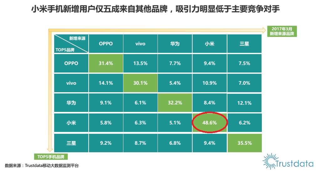 Trustdata发布了《2017年Q1中国移动互联网行业发展分析报告》,数据来自日活跃用户超过5000万的样本集,样本范围很大。安卓阵营的数据显示,小米新增用户仅有五成来自其他品牌,品牌吸引力最低;而OPPO、vivo、华为和三星的新增用户中均有约2/3的用户来自其他品牌,体现了很强的品牌吸引力。