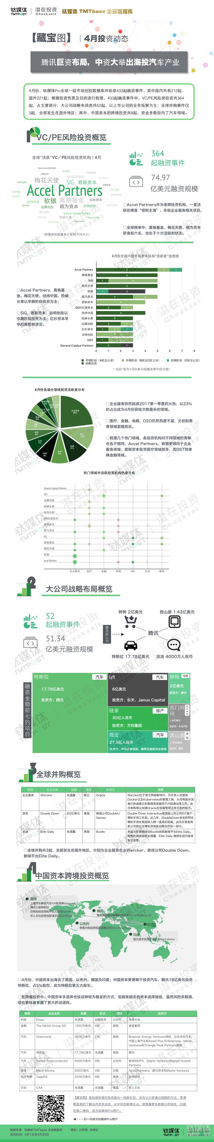 【藏宝图】是钛媒体潜在投资推出一档新的市场读图栏目,旨在让大家通过阅图的方式,更清晰直观的了解当月资本动态,从中找到新增长点。我们根据钛媒体Pro全球一级市场创投数据库,梳理出4月份活跃在一级市场的十五家投资机构,“活跃”定义为参与投融资事件的次数,本月的“龙虎榜”已经出炉,其中你能发现更多中国资本的身影。更详细报告,注册成为钛媒体Pro用户获取。注册地址:http://www.tmtpost.com/pro