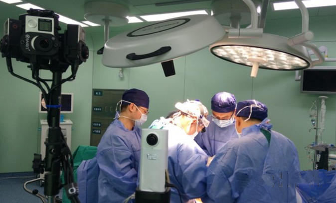 为了让观看视频的医生或者医学生有更清晰的视角,最后解决方案是,让主刀医的头部佩戴一台普通摄像机进行录制,然后再将画面植入到VR视频中。