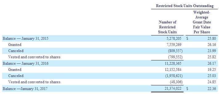 此外,过高估值过后,如果公司或员工发现原定的行权价格过高,激励对象根本不愿意行权,譬如,Cloudera限制性股份的行权数字从2014财年799,552股的直线下降到2015财年的48,306股,这样,往下调整行权价格就势在必行,截至2016年1月31日,该公司向员工和高管授予的限制性股份的平均价格已经从前一年度每股26.16美元的平均价格下调到了19.25美元。但可以想象,这样节节下滑的行权价格必然会对在前激励对象造成不良影响。
