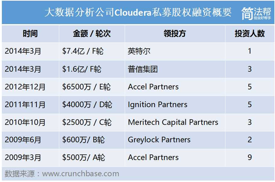 2014年3月18日,Cloudera公司宣布完成1.6亿美元(F轮)融资,投资人包括普信集团、谷歌风险投资以及戴尔家族的基金;公司投后估值不足20亿美元。