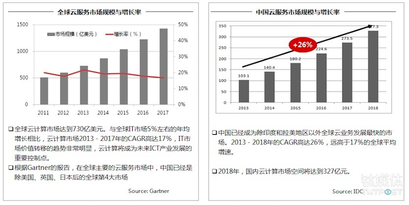 左边这张图表是Gartner在2014年对云计算市场的分析。2014年时的数据显示全球云计算市场规模达到730亿美元,当时的年均复合增长率是17%,远远高于全球的传统IT市场增长率。由此可以看出,云计算业务的兴起其实是改变了原先传统IT架构演进和发展的速度。同时当时数据显示,中国的云计算业务发展的复合增长率是达到26%,远高于全球的平均水平。