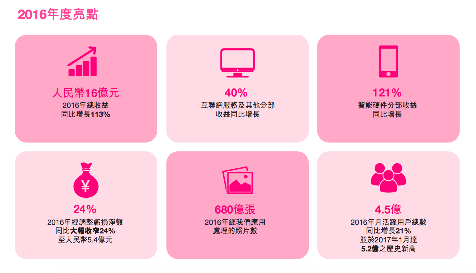 另外,蔡文胜能够为美图唱的赞歌不只是为股价,还有业绩表现和战略部署等。美图在4月发布了2016年业务报告,蔡文胜认为成绩是令人欣喜的。美图2016年年度业绩报告显示,2016年总收益同比增长达113%,智能硬件部分收益同比增长121%。另外,海外用户突破5亿,取得27%的增长。蔡文胜表示,下一步将围绕如英国、法国 、阿根廷等超过5000万人口的国家展开国际化布局。