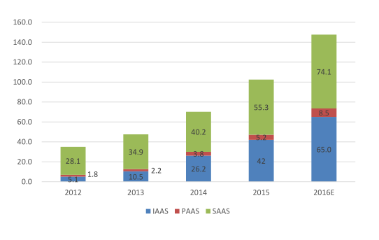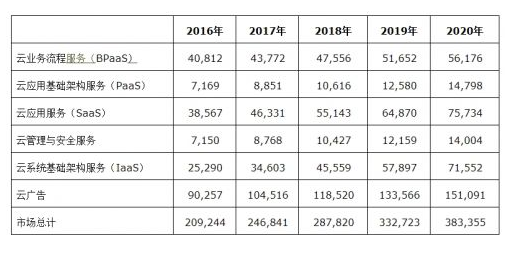 以公有云市场为例,据全球领先的信息技术研究和顾问公司Gartner预测,全球公有云服务市场将从2016年的2092亿美元增至2017年的2468亿美元,增幅高达18%。最高增速将来自IaaS(基础设施即服务),预计将在2017年增长36.8%,达到346亿美元;SaaS(软件即服务)预计将增长20.1%,达到463亿美元。
