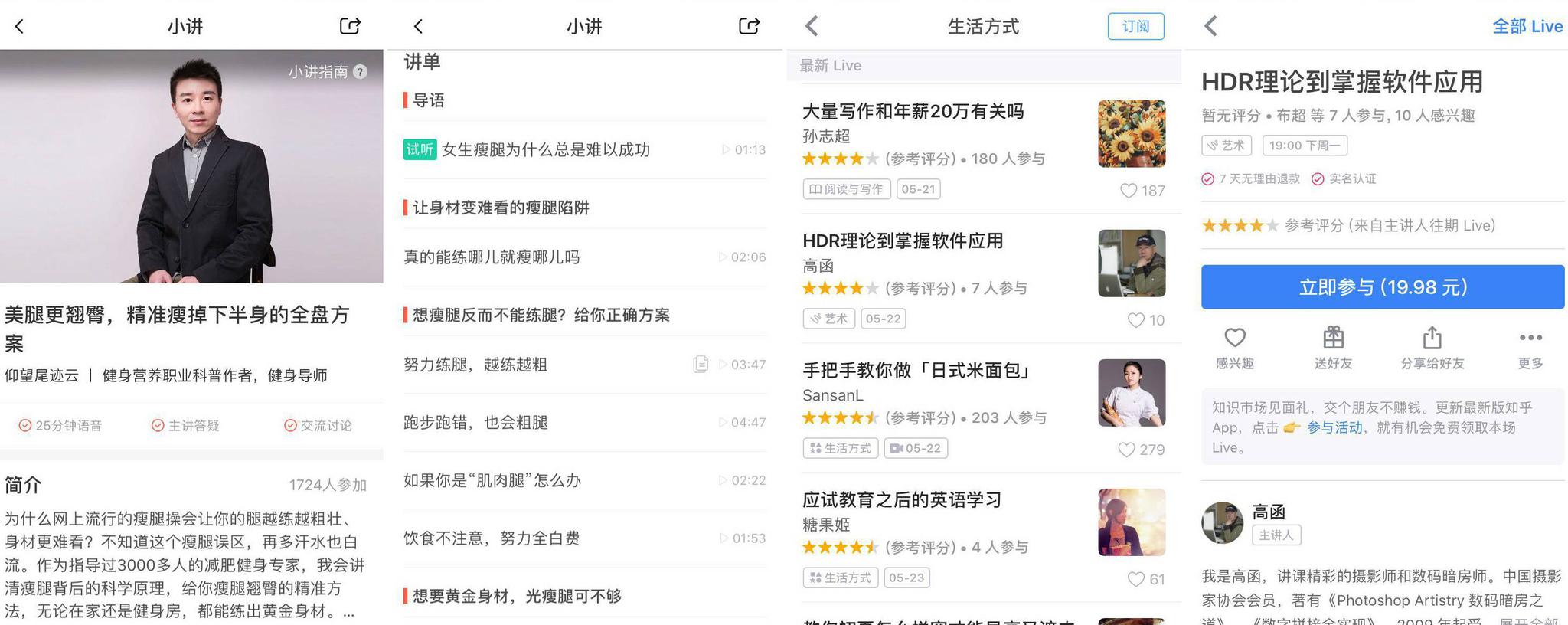 课程模式是今年竞争比较激烈的领域,主要的代表是分答小讲、知乎live还有一块听听。分答小讲的对主讲有比较严格的筛选机制,按照机构化的方式进行输出,每个主题都被拆成了若干章节便于检索,交流互动放在内容之后;知乎live则是工具化定位,讲主对外是开放申请的,有评分系统,卖点主打实时交流。