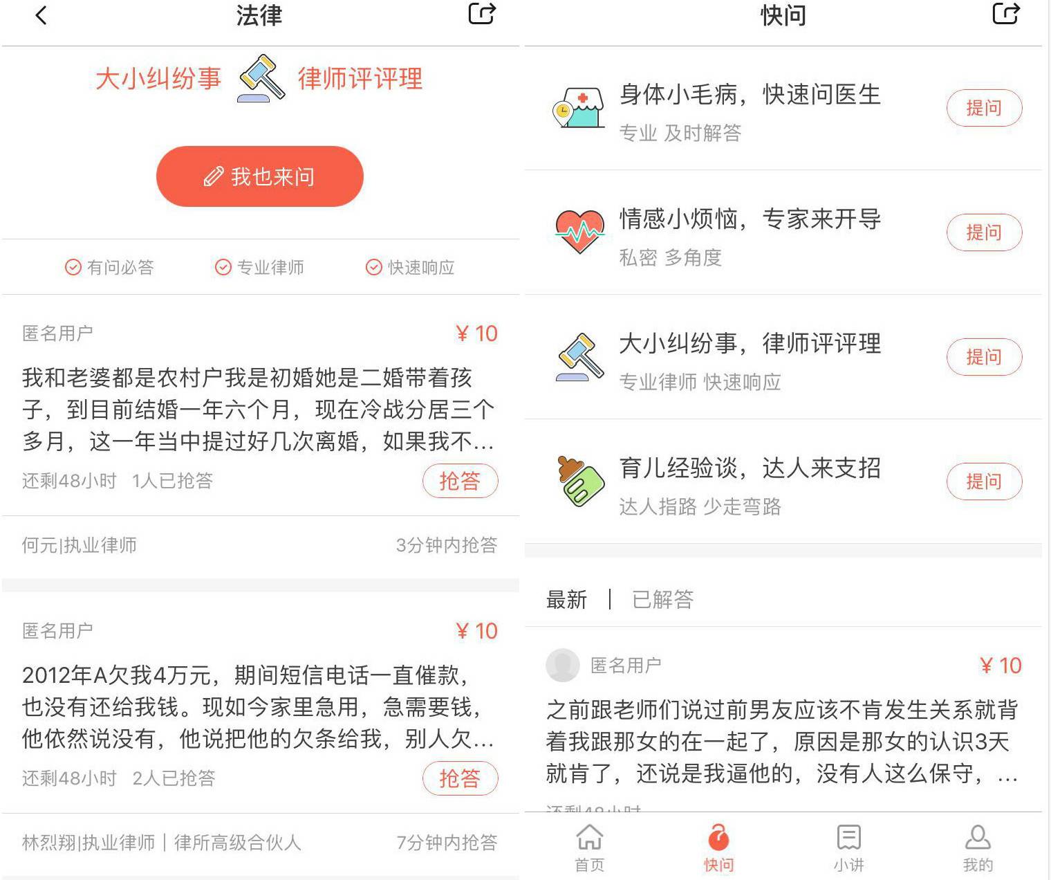 2. 问答模式推出了一种抢单模式的新形态快问,问题量与回答速度都还不错,但是仅仅保留了健康、法律、情感和育儿4个类别。