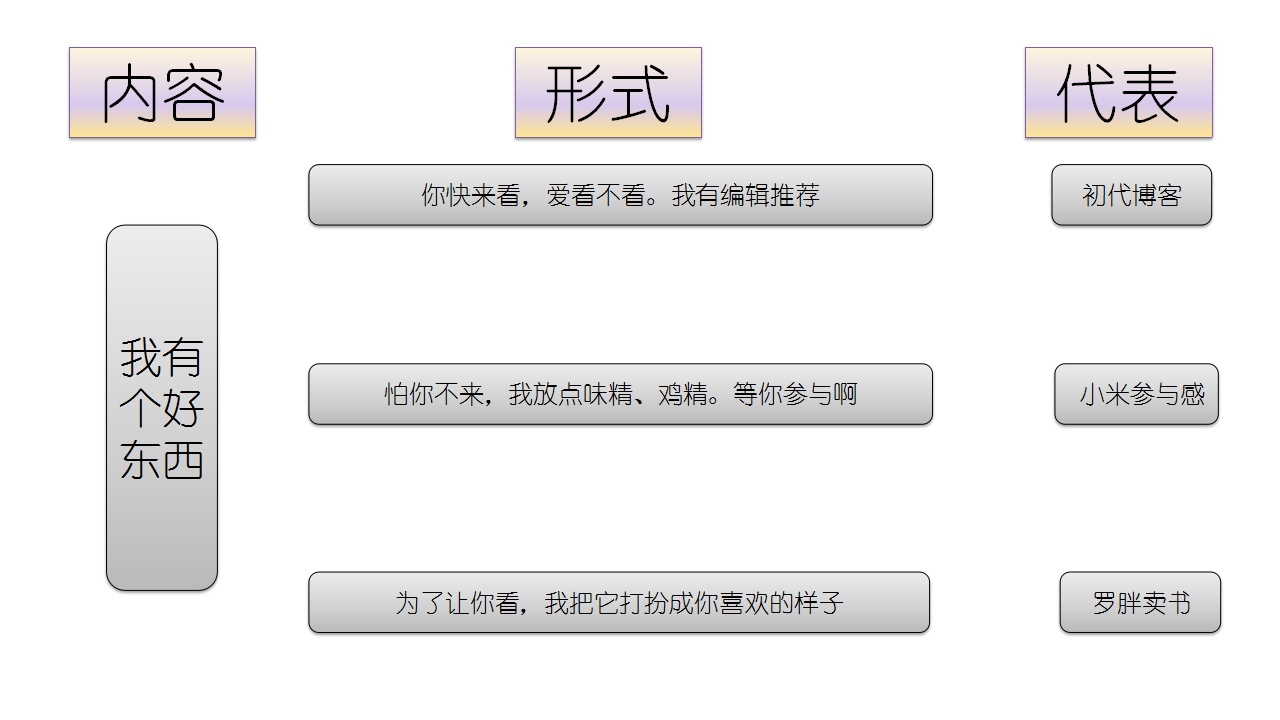 我有个好东西,为了让你看,我把它打扮成你喜欢的样子,比如罗胖用讲故事的方式买一般没人看的书。