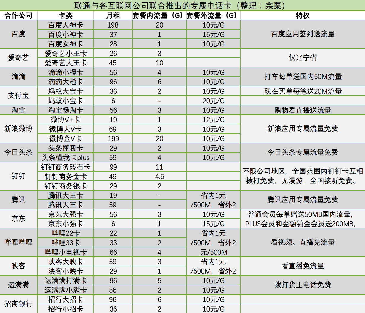 联通与各互联网公司联合推出的专属电话卡(整理:宗栗)