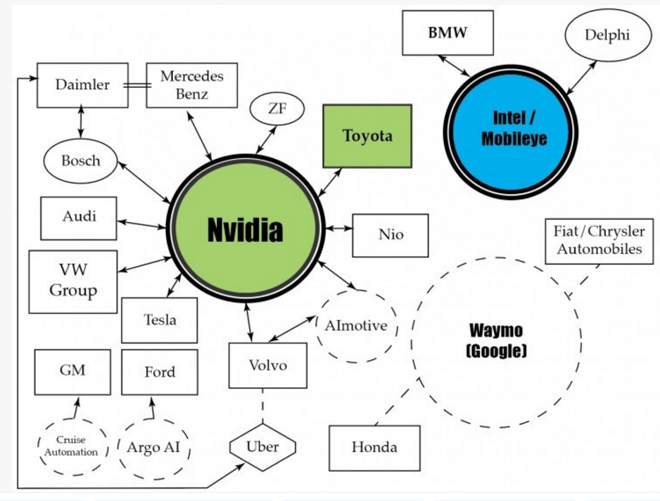 这里不能不提到跟英特尔-宝马“联盟”相爱相杀很久了的“部落”:由英伟达、戴勒姆、大众等组成的另一个自动驾驶产业联盟。