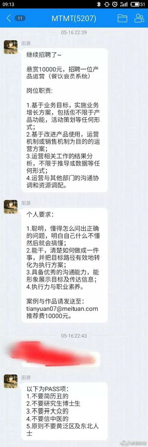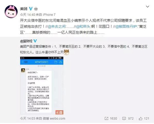 该招聘信息一经流出迅速引发网友质疑,认为美团点评在招聘方面涉嫌歧视。对此美团官方微博回应:“开大众信中医的东北河南混血丑小编表示个人观点不代表公司招聘要求,该员工正被拖出去打!”