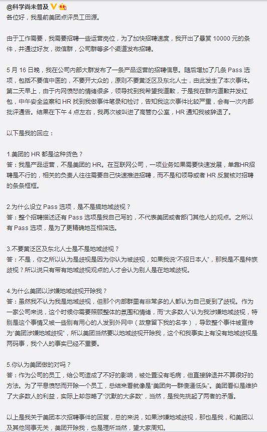 此事到这里仍然没有结束,5月18日,该名被辞退的员工在个人微博上发表了自己对于此次事件的回应,其字里行间并未表露出明显的歉意,称自己设立Pass选项是为了更好的进行精确筛选,并认为自己没有地域歧视的言行,而是此次事件的“牺牲品”。自己是被一些别有用心的人坑了,这些人将“招聘信息”发到外网中,并故意留下他的名字,才导致整个事件被宣传成“美团涉嫌地域歧视”。对于自己被美团辞退一事,田源称,直接辞退并不算很好的方法。总结来看就像是“美团向一群傻逼低头”。