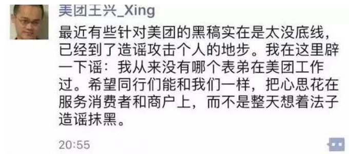 “我辟一下谣:我从没哪个表弟在美团工作过。希望同行们能和我们一样,把心思花在服务消费者和商户上,而不是整天想着法子造谣抹黑。”王兴在美团点评接连遭遇谣言侵扰的时候,说了这句话。