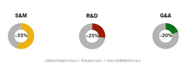 在单笔成交量小,用户量也不大的情况下,不想当炮灰的SaaS厂商往往借助两条路:第一,免费。2014年前后,dayHR、钉钉、今目标、云之家等都用过这招。到了现在,“免费午餐”、“共享经济”玩了太多,这招基本已经用烂。第二,广告。烧钱做市场是TO C惯用招,从OTA、餐饮到打车、招聘,捧红了几代明星。TO B领域,纷享销客、钉钉也有过尝试,市场投入在亿元级别。在业内发布的成本支出表中,大部分SaaS公司销售和市场成本高达55%,超过研发成本(25%)和综合行政管理成本(20%)总和。但企业消费毕竟不同于个人消费,销售力很难换成等价的购买力。更尴尬地是,一旦产品成为软肋,还可能自毁前程。