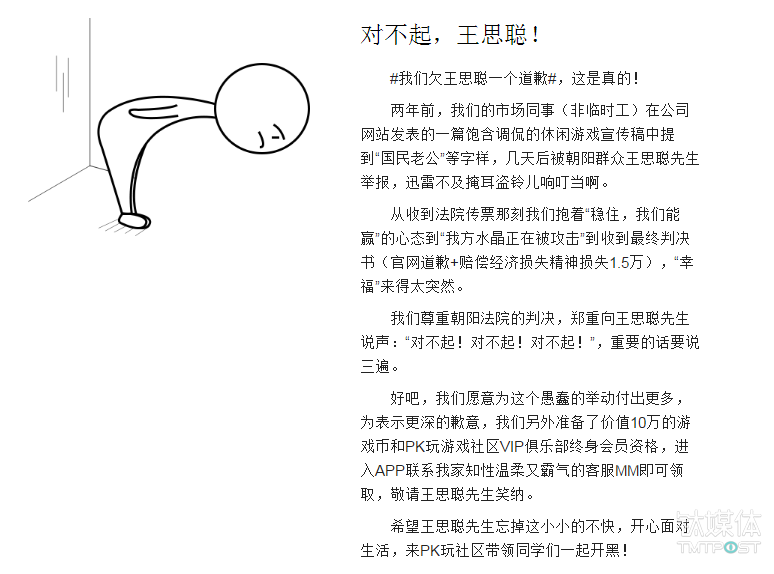 近日,深圳市鱼丸互动科技有限公司旗下网站上线了一封名为《对不起,王思聪!》道歉信,这预示着备受关注的“王思聪诉H5游戏《思聪的日子》侵权案件”尘埃落定。