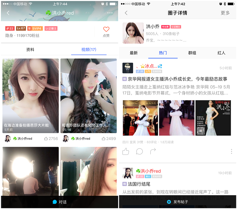 所以,洪小乔几乎所有时间都在陌陌“消耗”了。她要么在直播,要么就用群组、动态等功能维护和粉丝们的关系。在发现短视频能获得高流量后,她也加快了发布视频的频率。