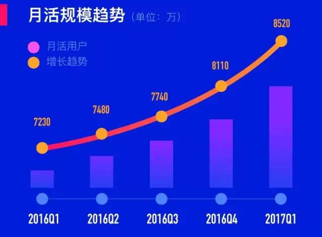 不过,随着陌陌直播的崛起,陌陌月活量从2016年一季度一路上涨。2016年四个季度的用户月活量分别是7230万、7480万、7740万、8110万。到2017年一季度,陌陌用户月活量达到8520万,同比增长18%。