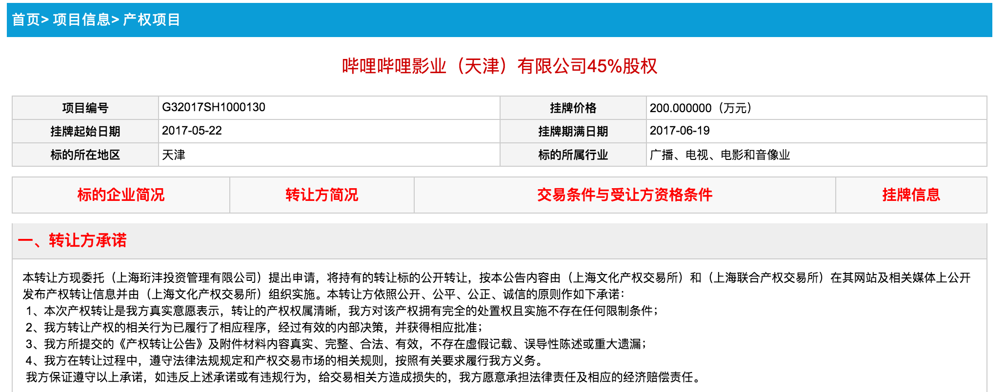 5月22日,上海联合产权交易所上挂出了一则转让哔哩哔哩影业(天津)有限公司45%股权的项目信息,转让方为上海尚世影业有限公司,挂牌价格为200万元。
