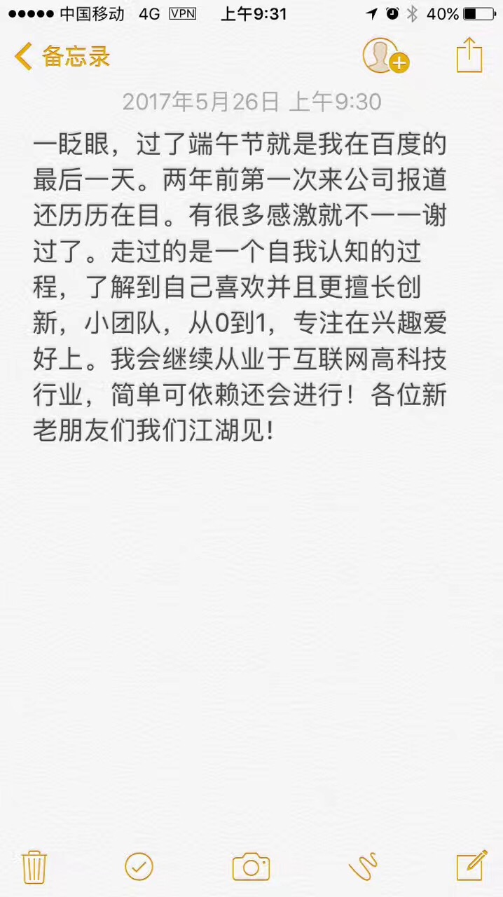 钛媒体快讯 | 5月26日消息:百度副总裁陆复斌今日在朋友圈宣布即将离开百度,陆复斌透露,过了端午节就是其在百度的最后一天,自己会继续从业于互联网高科技行业。