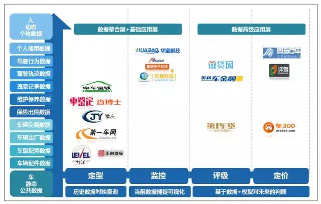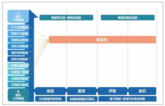 从纵向所需要的数据源看,完整严谨的车抵贷交易需要在贷前查询车型配置数据,车辆出厂数据,车辆交易数据,保险出险数据,维护保养数据,违章数据,个人信用数据,在贷中持续监控驾驶轨迹数据以及出险,维护保养,违章等数据。