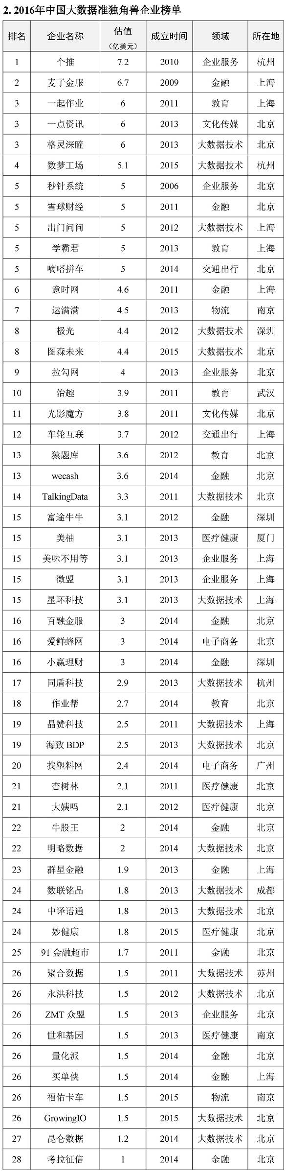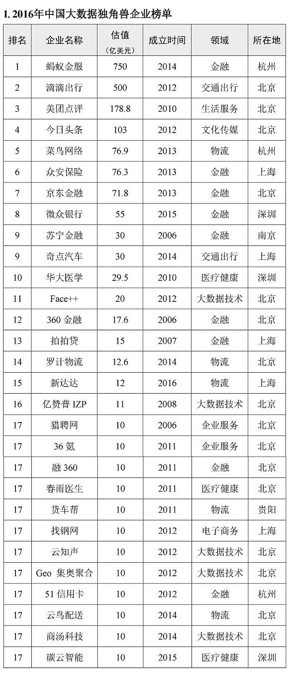 2017年5月26日,北京市长城企业战略研究所在贵阳举行的2017中国国际大数据产业博览会上,发布了《2016中国大数据独角兽企业发展报告》。