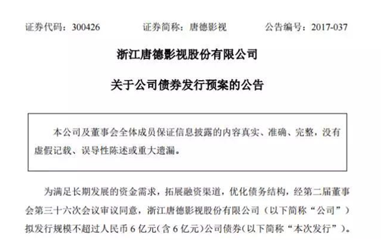 据悉,5月20日,唐德影视发布债券发行方案,拟发行不超过6亿元的公司债券,期限不超过5年(含5年),募集所得资金将用于调整债务结构、补充流动资金、投资于资本性支出项目中的一种或几种用途等。