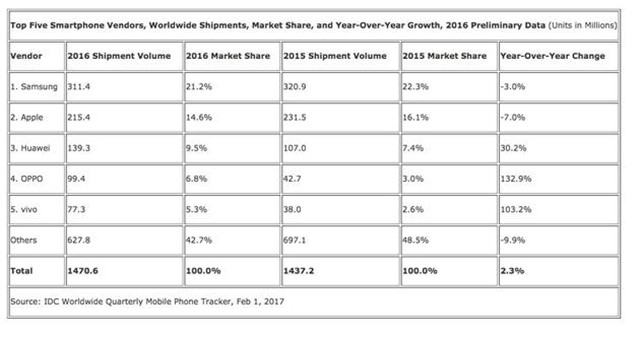 注册于2009年的vivo,2011年才进入智能手机领域,但截至2016年底销量(IDC在2017年2月所发布的2016年全球智能手机销售数据)已全球排名第五,国内排行第三。